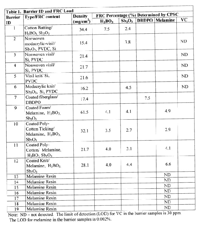 CPSC Table 1 showing the percentage of Known Toxic Chemicals contained in